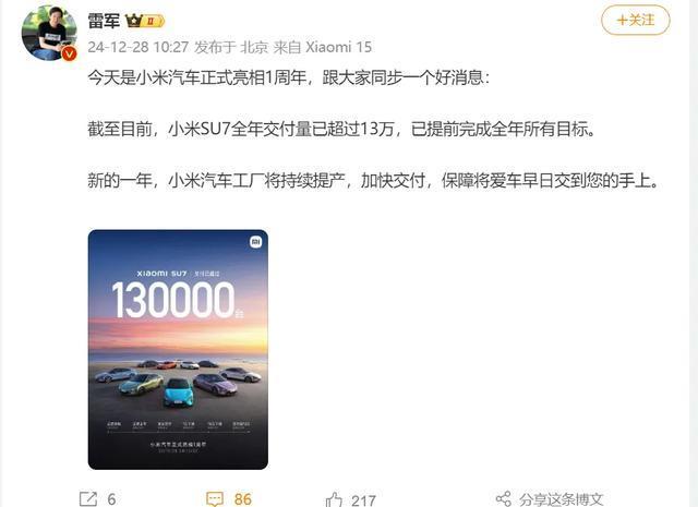 12月28日,雷军再次发文称,小米SU7全年交付量已超过13万,已提前完成全年所有目标。